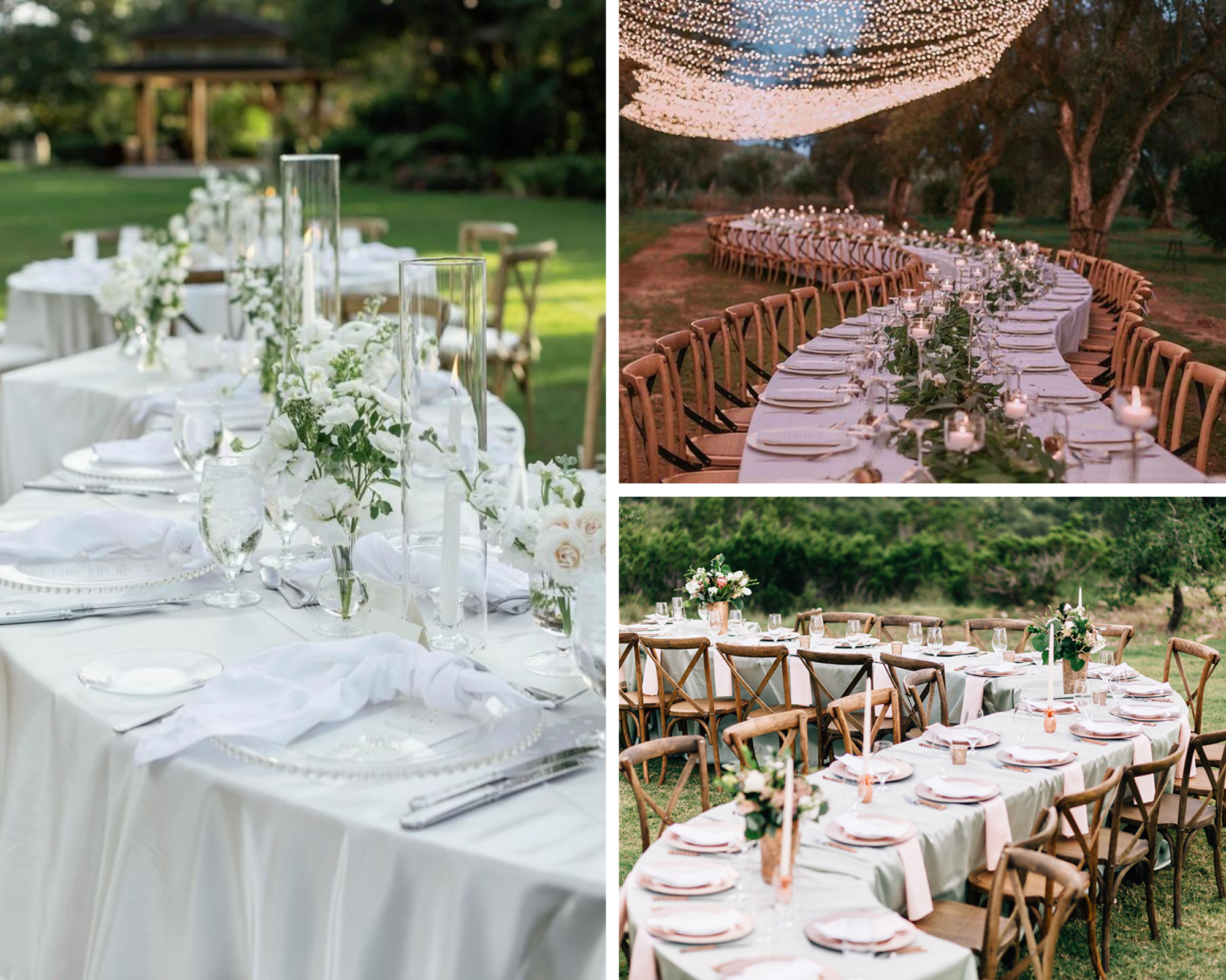 These flowing, curved tables create visual drama and encourage guests to mingle in a more relaxed, conversational way. They’re ideal for outdoor receptions, especially under festoon lighting or soft hanging lanterns.