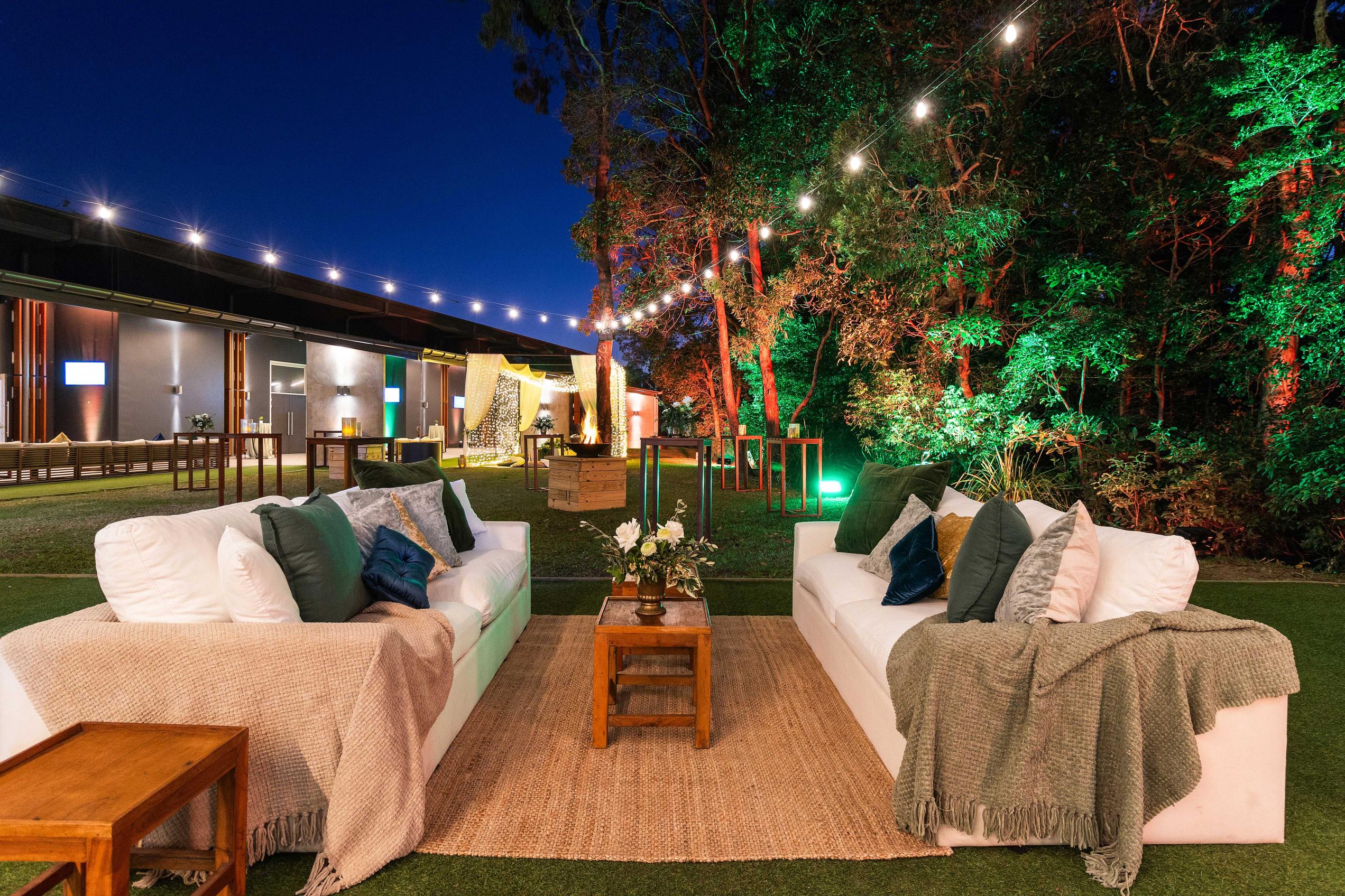 - Outdoor pre-dinner drinks with a styled bar + lounges, then move guests into dinner