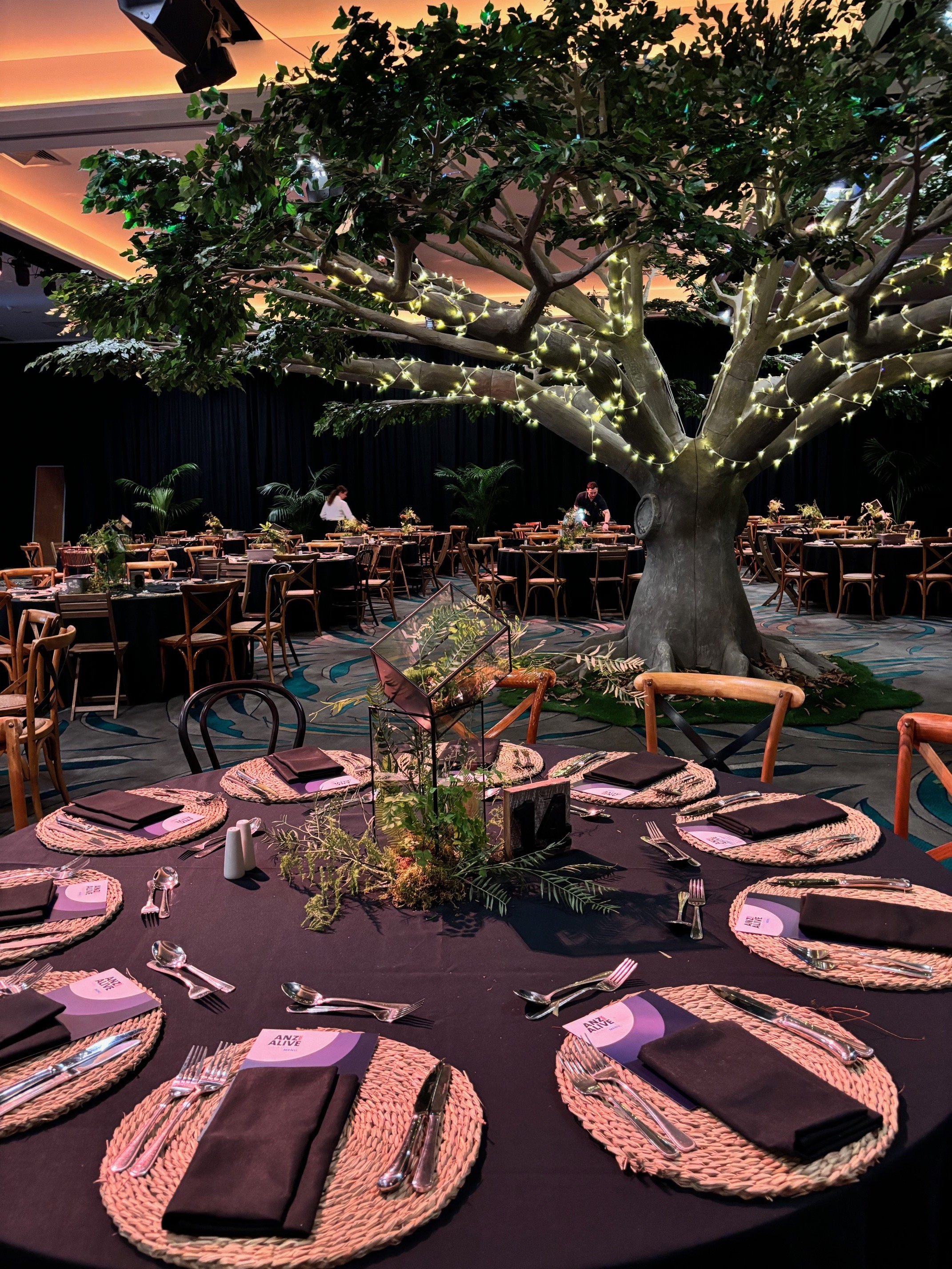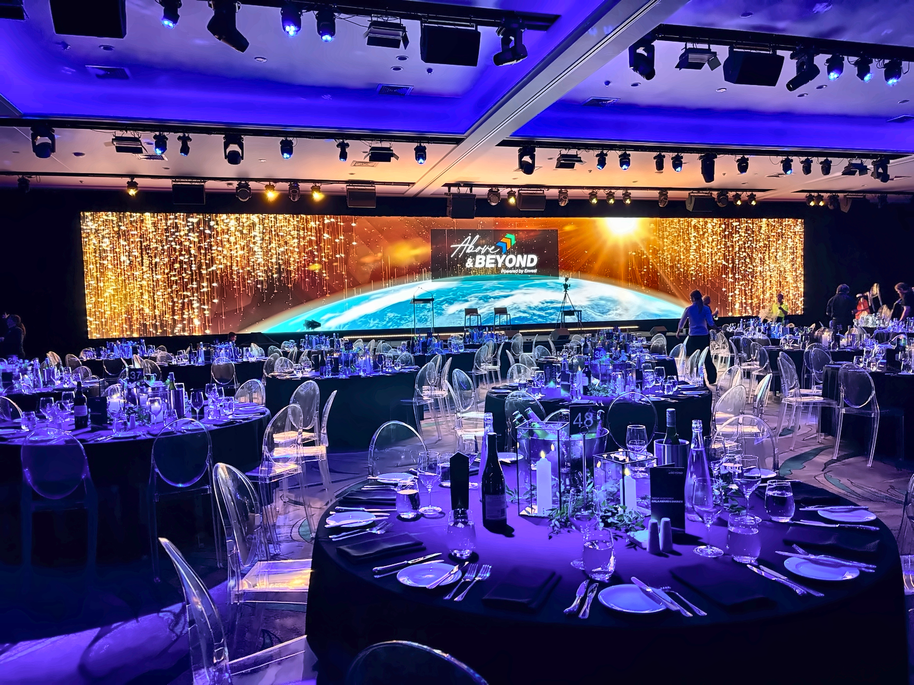 - Immersive theme night: One strong theme expressed through colour, texture, signage and lighting, with a hero arrival moment and a styled photo set guests actually use. After awards, the room shifts into party mode with lighting, music and lounge zones.