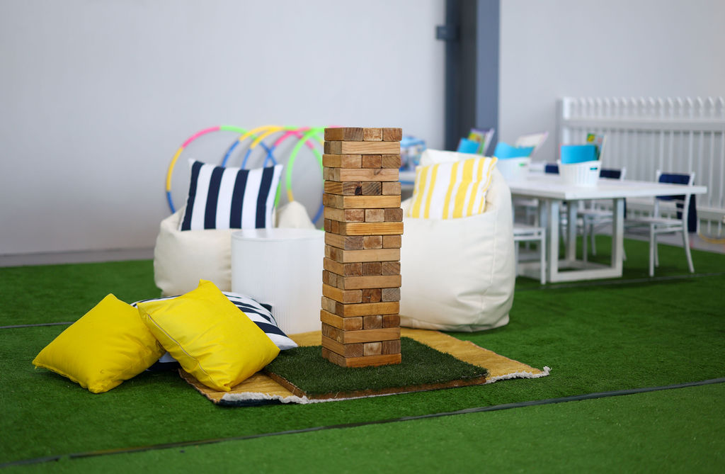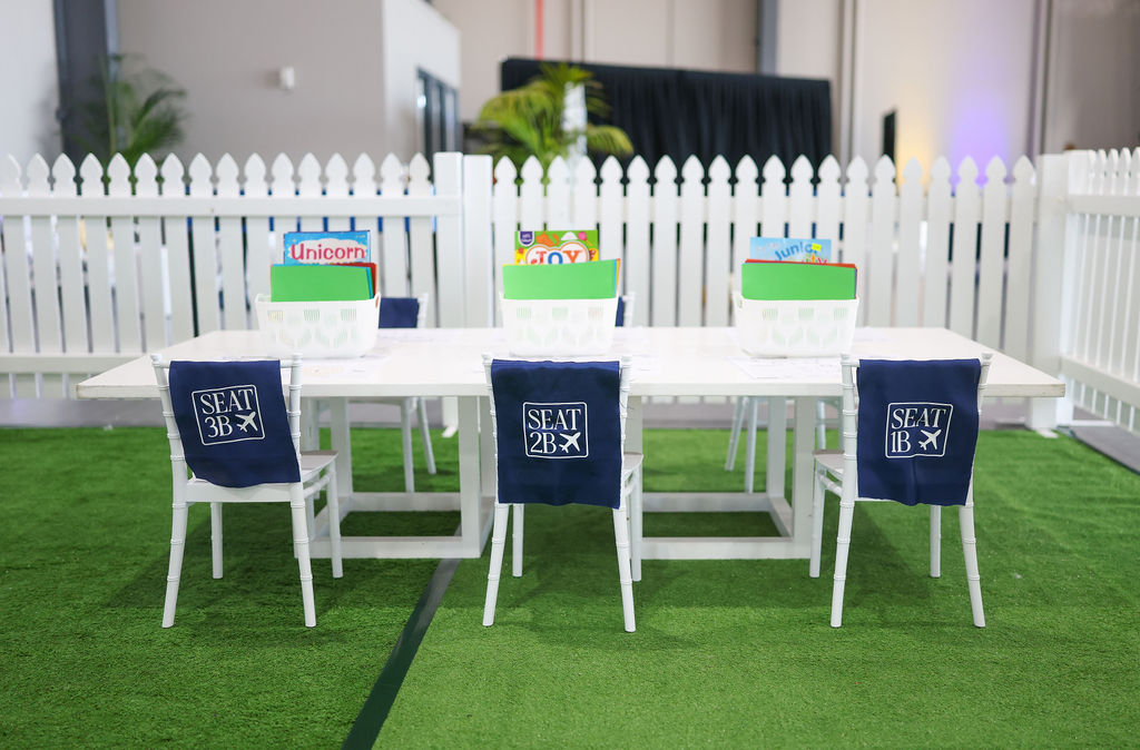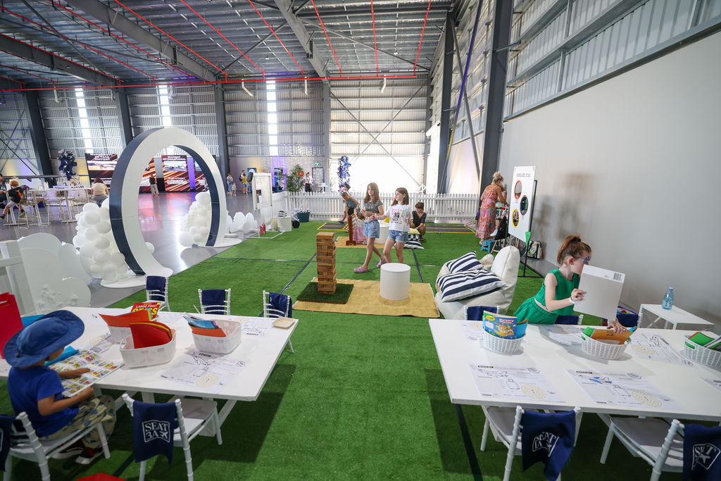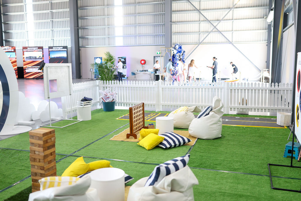 To complete the experience, we designed a dedicated children’s area “The Little Flyers Lounge”, a playful space featuring white picket fencing, turf, and cloud-like balloons, with creative play stations.