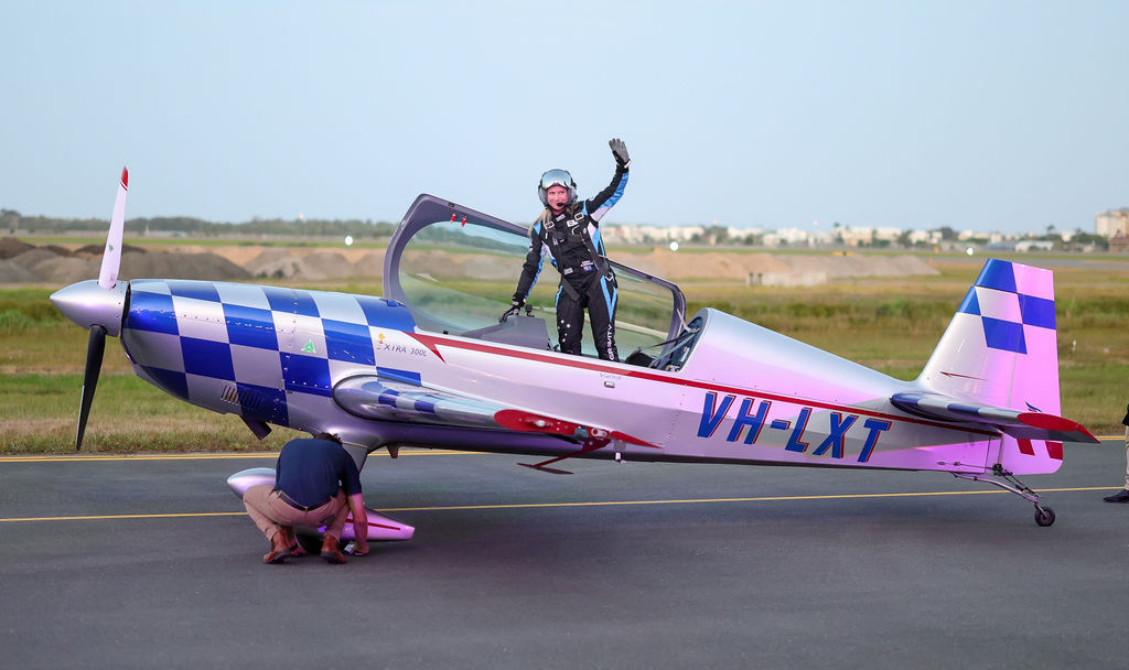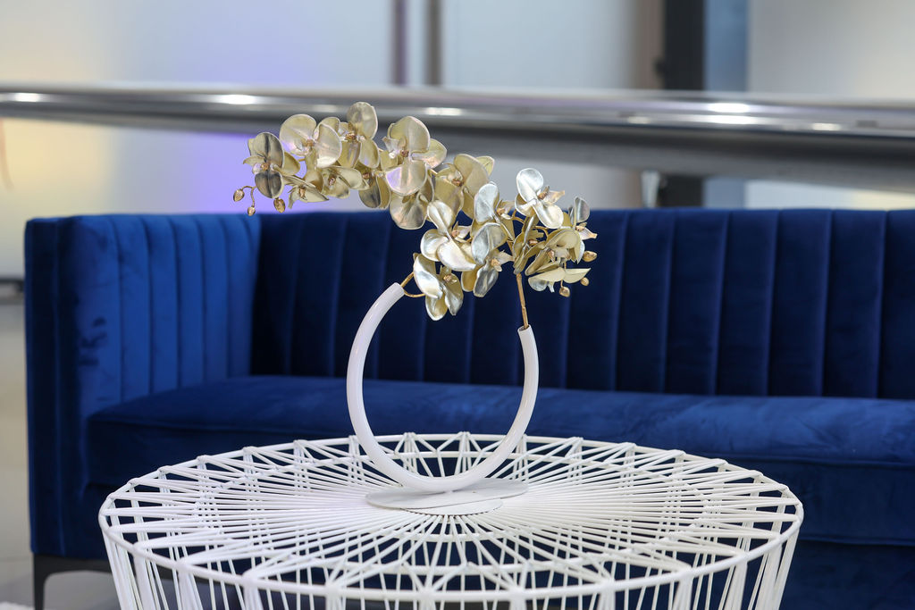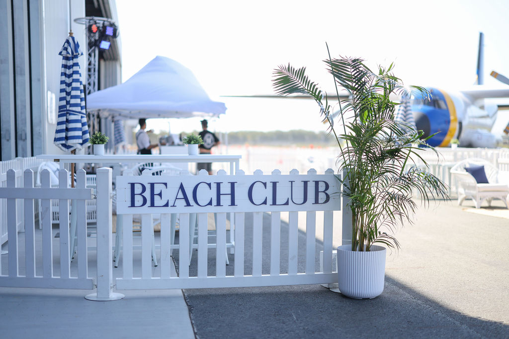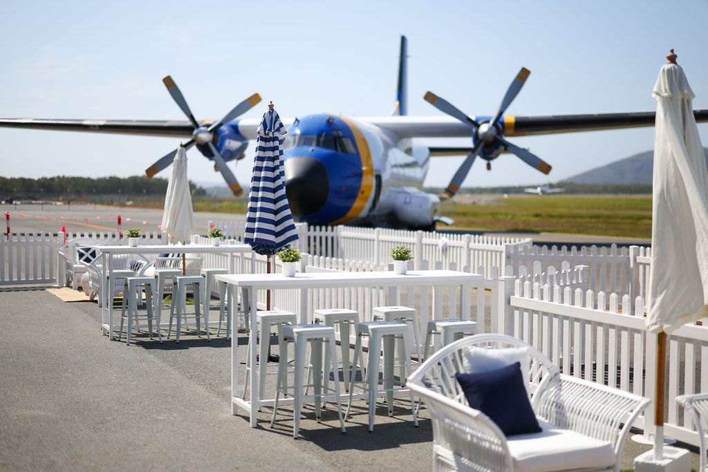 Our concept took inspiration from the aviation setting, blending sleek white lounges, plush navy velvet seating, gold accents, and sculptural florals for a refined, contemporary feel. Outdoors, striped umbrellas and coastal bar seating created a relaxed setting to enjoy the airshow and celebrate under the Sunshine Coast sky.