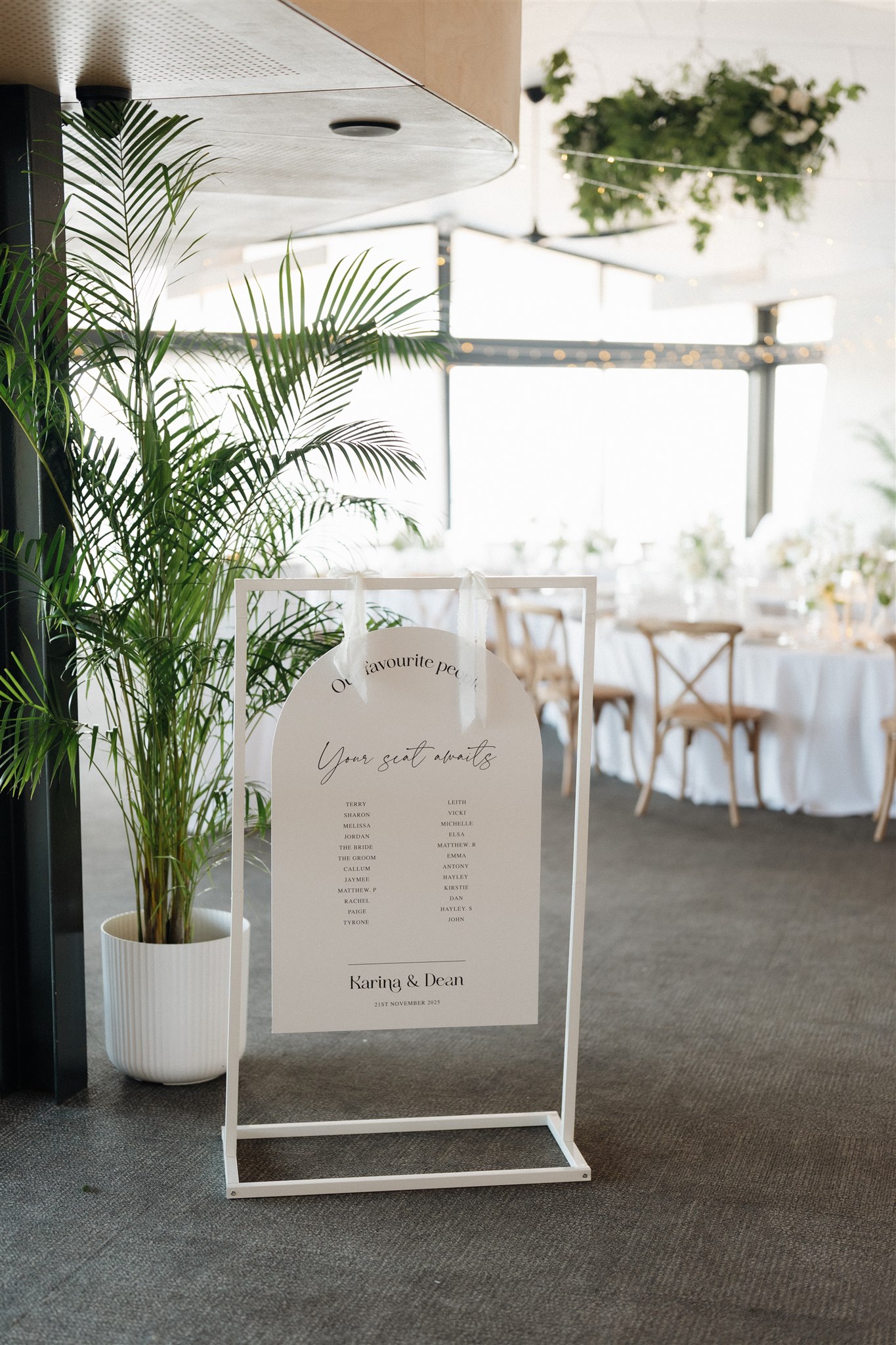 The ceremony took place on a private lawn beside Sunshine Beach Surf Club, overlooking the ocean, where crisp white florals and sculptural arrangements framed the view without competing with it. White ribbed plinths, soft petals underfoot and our natural Hampton chairs created a modern, coastal ceremony that felt effortless.