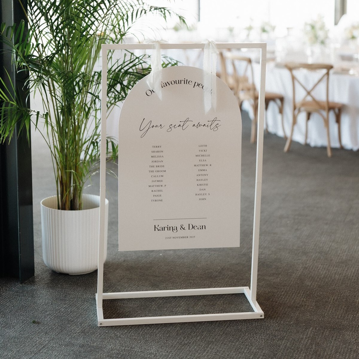 Arched Seating Chart on white stand customised and available in various colours, styles and fonts