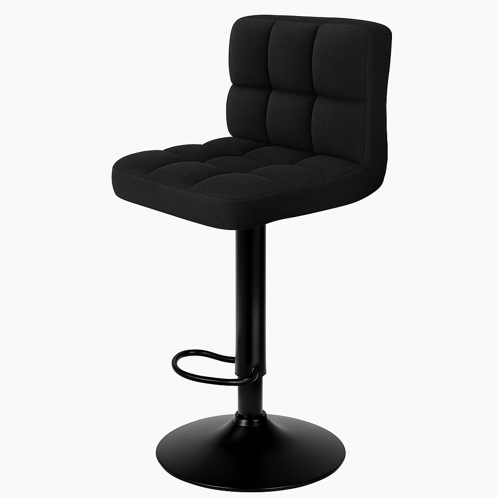 Sleek black bar stool with padded linen seat, 360-swivel and height adjust — perfect for event bars, cocktail functions and VIP lounges.